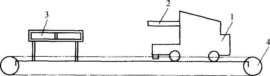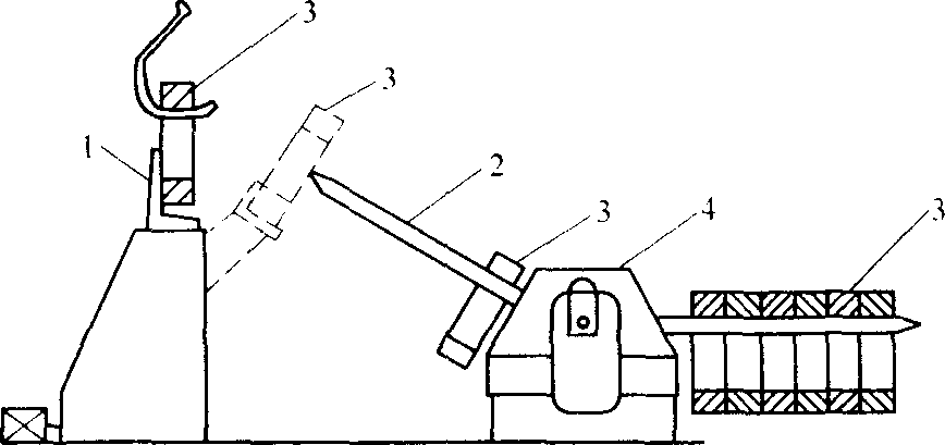 圖1-2 用卸卷小車的盤卷卸卷裝置示意圖 1,卸卷小車 2,升降橫桿 3,固定收集架 4,鏈條傳動機構