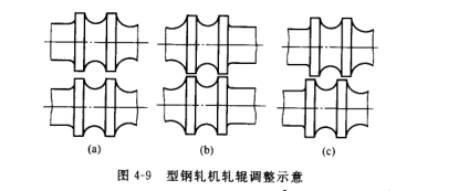 圖4-9(b)所示為正確孔型位置;圖(a)輥縫過大,必須進行上,下徑調整,他由壓下裝置或壓上裝置來完成;圖(c)為上,下輥槽左右沒有對中,必須進行左右軸向調整。