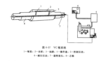 VC輥系統(tǒng)(圖 6-37)由 VC輥、液壓動力裝置、控制裝置和操作盤等組成。VC輥包括輥套、芯軸、油腔、油路和旋轉(zhuǎn)接頭等。在輥套和芯軸之間是油腔,軸套兩端緊密地?zé)嵫b在芯軸上,以便使其在承受軋制力的同時(shí)能耐高壓密封。液壓動力裝置的高壓油經(jīng)旋轉(zhuǎn)接頭向輥?zhàn)庸┯,通過控制高壓油使輥套膨脹,以補(bǔ)償軋輥撓度。油壓為0~50MPa,軋輥凸度在較大壓力下,沿半徑方向較大凸度軋鋼時(shí)可達(dá)0.27mm,軋鋁時(shí)可達(dá)0.33mm。