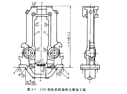 機(jī)架是軋鋼機(jī)主要零部件,為了保證正常軋制,為了保證必要的軋制精度及安裝調(diào)整的方便,對機(jī)架的機(jī)械加工有嚴(yán)格的要求。下面以1150初軋機(jī)機(jī)架為例,簡單地介紹機(jī)架加工方面的技術(shù)要求(見圖3-7)