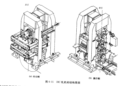 HC軋機(jī)的結(jié)構(gòu)與四輾軋機(jī)無(wú)多大區(qū)別,其關(guān)鍵的不同處在于 HC 軋機(jī)有一套軸向移動(dòng)裝置,如圖6-15 所示,中間輥的軸向移動(dòng)可用液壓缸的推、拉來(lái)實(shí)現(xiàn)。將中間輥軸承座與液壓缸連接裝置安裝在操作側(cè),便于操作和換輥,油壓回路采用同步系統(tǒng)保證上,下、中間輥對(duì)稱(chēng)移動(dòng),中間輥移動(dòng)油缸在機(jī)架左右立柱右側(cè)上,易于加工維護(hù)。HC軋機(jī)的六個(gè)軋輾成一列布置,工作輾有液壓正彎或正、負(fù)彎,它的彎輥力效果比一般四輾軋機(jī)的彎輾力效果增大約三倍以上,因此,彎輥力可選擇較小而效果大。通過(guò)彎輥力變化進(jìn)行在線(xiàn)板形微調(diào)補(bǔ)償,實(shí)現(xiàn)板形的閉環(huán)控制。