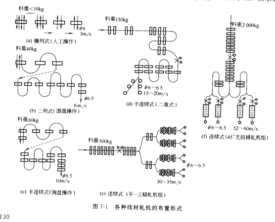 20世紀(jì) 50年代發(fā)展了半連續(xù)式線材軋機(jī)。粗軋機(jī)組布置成連續(xù)式,精軋機(jī)組布置成橫列式,中軋機(jī)組布置成連續(xù)式或橫列式。在機(jī)械化程度較高的半連續(xù)線材車間中,可以不用人工喂鋼,成品較高軋制速度可達(dá)16m/s,單重達(dá)到 200kg,年產(chǎn)量可達(dá)到 20 萬~35萬噸。半連續(xù)式線材軋機(jī)的布置形式如圖7-1(c)、(d)所示。