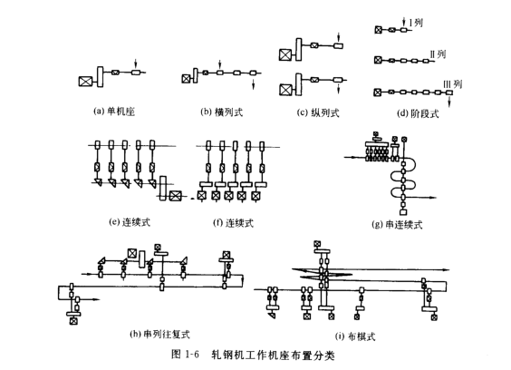 軋制比較復(fù)雜的斷面(角鋼,槽鋼等),因此連軋機(jī)調(diào)整復(fù)雜,通常采用半連續(xù)式(見圖1-6g),它是由兩個(gè)機(jī)座組成,其中一組布置成連續(xù)式(粗軋機(jī)組),另一組布置成橫列式精軋機(jī)組或階段式。