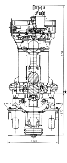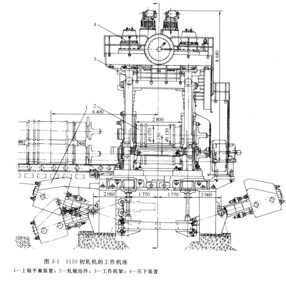 國產(chǎn)1150初軋機的主傳動形式為兩個低速直流電動機(功率4560kw,轉速0-70-120r/min)通過萬向連接軸分別傳遞兩個軋輥。上軋輥的主連軸器放在下軋輥主電機的上面。工作滾名義直徑為φ150mm,重車后較小直徑為φ1080mm,輥身長度為2800mm。1150初軋機的工作機座如圖3-1所示。他是由軋輥部件,機架部件,壓下平衡裝置等組成,但是每個部件都有其自己的特點,與板帶軋機和型鋼軋機不同。
