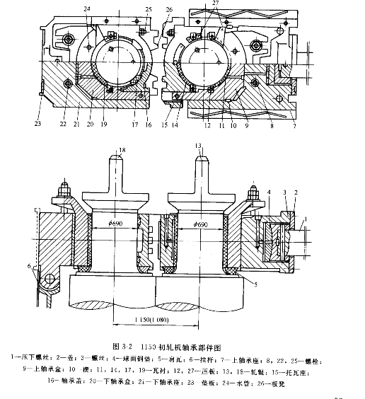 1150初軋機軋輥部件的結構圖及立體示意圖如圖 3-2 及圖3-3所示。上軋輥放置在上軸承盒9及托瓦座 15 之間。瓦襯都是夾布膠木瓦,上軸承盒中有徑向瓦襯11 及肩瓦5,托瓦座中同樣也有徑向瓦襯14 及肩瓦。徑向瓦襯是用壓板 12定位。上軸承盒的腿插入托瓦座,并用螺栓 25緊固連接。初軋機與型鋼軋機不同點在于;在上軸承盒及機架間尚有一個上軸承座 7,上軸承座通過球面銅墊 4 與壓下螺絲1相接觸。軋制時,軋制壓力通過上軸承盒、上軸承座、球墊、壓下螺絲較終傳遞給機架上橫梁。在上軸承盒的上部有兩個突耳,突耳通過固定在上軸承座的螺栓 8使軋輥進行軸向調(diào)整。這種軸向調(diào)整的形式對于上軋輥移動量極大且次數(shù)頻繁的初軋機是較理想的,這也是軋輥部件中多設置一個上軸承座的原因所在。上軸承座法蘭內(nèi)側鑲有耐磨滑板 28。