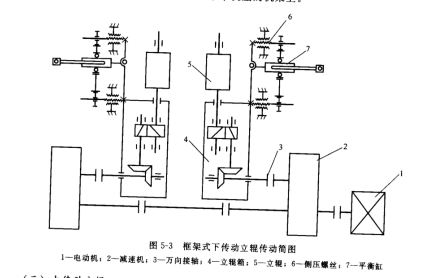 圖 5-3所示為框架式下傳動(dòng)立輥傳動(dòng)簡(jiǎn)圖。它是由一臺(tái)電動(dòng)機(jī)1,通過主傳動(dòng)減速機(jī) 2、萬向接軸 3、立輥箱 4來傳動(dòng)立輥5,為保證、右壓下螺絲的同步,減速機(jī) 2 之間用一根軸連接起來。為便于維護(hù)檢修,電動(dòng)機(jī)放在軋機(jī)組的主傳動(dòng)側(cè)。立輥機(jī)座的主傳動(dòng)裝置安裝在地基上,側(cè)壓螺絲6和立輥箱 4安裝在水平機(jī)座的機(jī)架上。