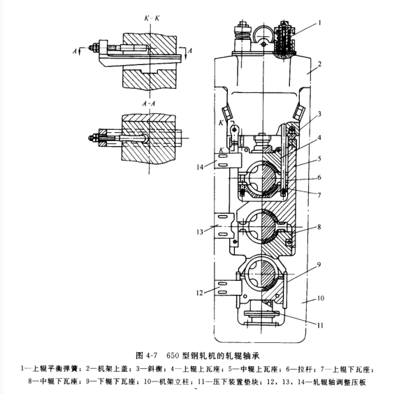 650型鋼軋機(jī)的軋輥軸承如圖4-7所示,五塊整體壓制徑向和軸向膠木瓦分為別裝在相應(yīng)的五個(gè)瓦座中,除中輥上瓦座5的材料為ZG40Cr外,其余瓦座為ZG35,上輥上瓦座4通過墊塊與壓下螺絲端部接觸,下壓座7通過拉桿6(每邊一根)掛在平衡彈簧上。為便于換輥,中輥上瓦座5是“H”形瓦座(簡稱H架),他向下的兩條腿通過嵌于機(jī)架上蓋燕尾槽中的斜楔3支撐在機(jī)架上,當(dāng)中輥襯瓦磨損時(shí),可通過斜楔3進(jìn)行調(diào)整,使“H”形瓦架始終壓在中輥輥頸上中輥的下瓦座8直接支靠在機(jī)架立柱的凸肩上,下輥只有下瓦座9,它通過墊塊11直接支在壓下螺絲上。