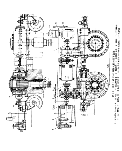 在 2300四輥熱軋鋼板軋機上有兩組壓下裝置,如圖 6-7、圖6-8所示。軋機的壓下速度為 2~12mm/s。兩組壓下裝置可以同時壓下調(diào)整,也可以在脫開電磁離合器5后進行單獨壓下調(diào)整。
